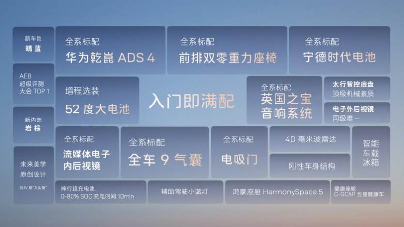 阿维塔坚持不以价格换市场,而以价值赢未来。阿维塔07 2026款入门即标配华为乾崑ADS 4、9安全气囊、双零重力座椅、英国之宝音响系统、电吸门、电子内后视镜、宁德时代电池,全系可选52度大电池,通过全系标配的越级配置,赋予用户全面进阶的新豪华驾乘体验,持续引领智能电动汽车向上发展。